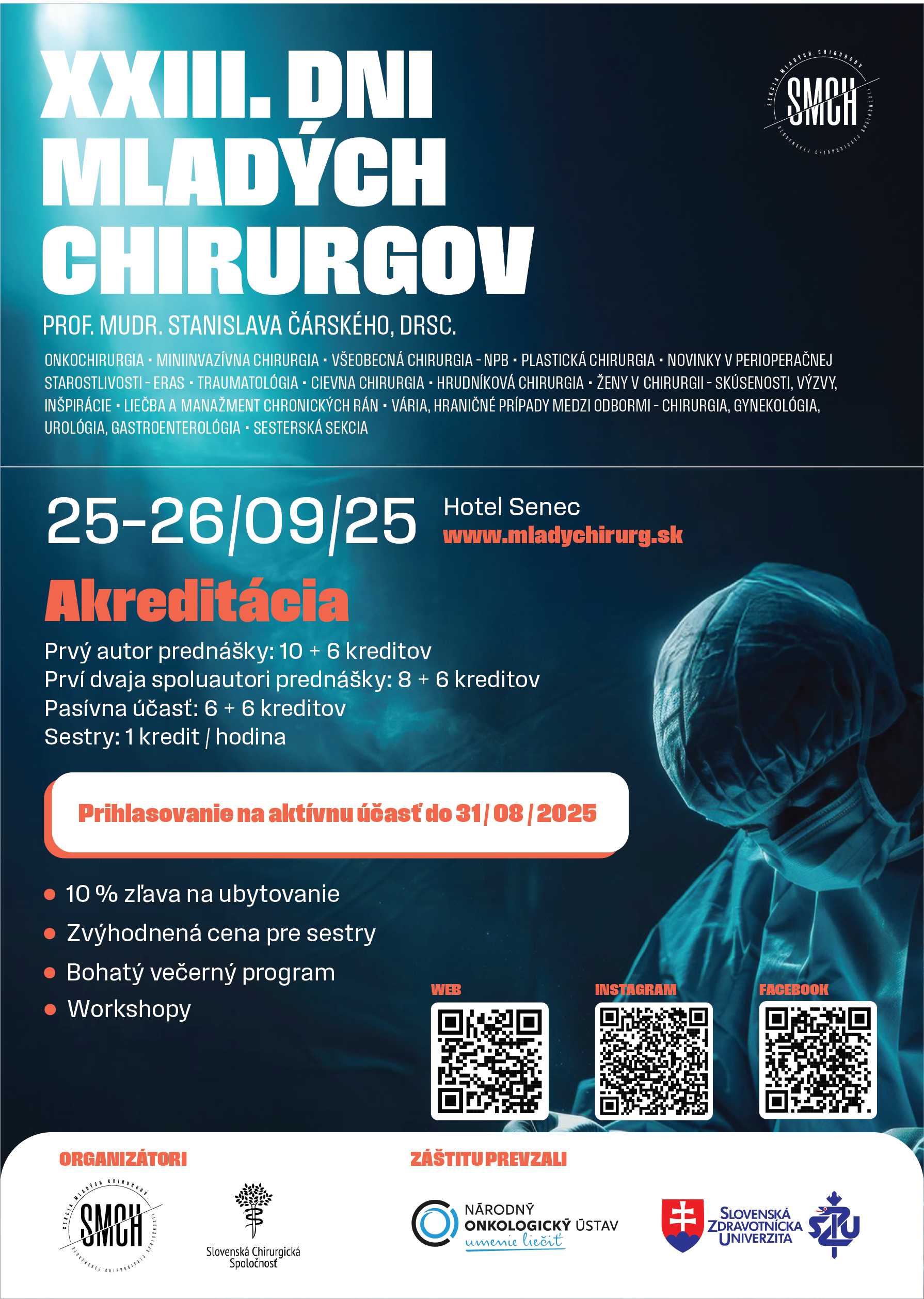 Tento ročník, organizovaný pod záštitou SCHS, Kliniky chirurgickej onkológie NOÚ a SZU, sa uskutoční v dňoch 25.-26. 9. 2025 v legendárnom hoteli Senec, kde má toto podujatie svoje nezabudnuteľné meno.